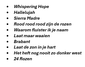 Grotendeels is ons repertoire afgestemd op de mensen voor wie wij doorgaans de meeste optredens verzorgen; bewoners van zorg- en verpleeginstellingen.